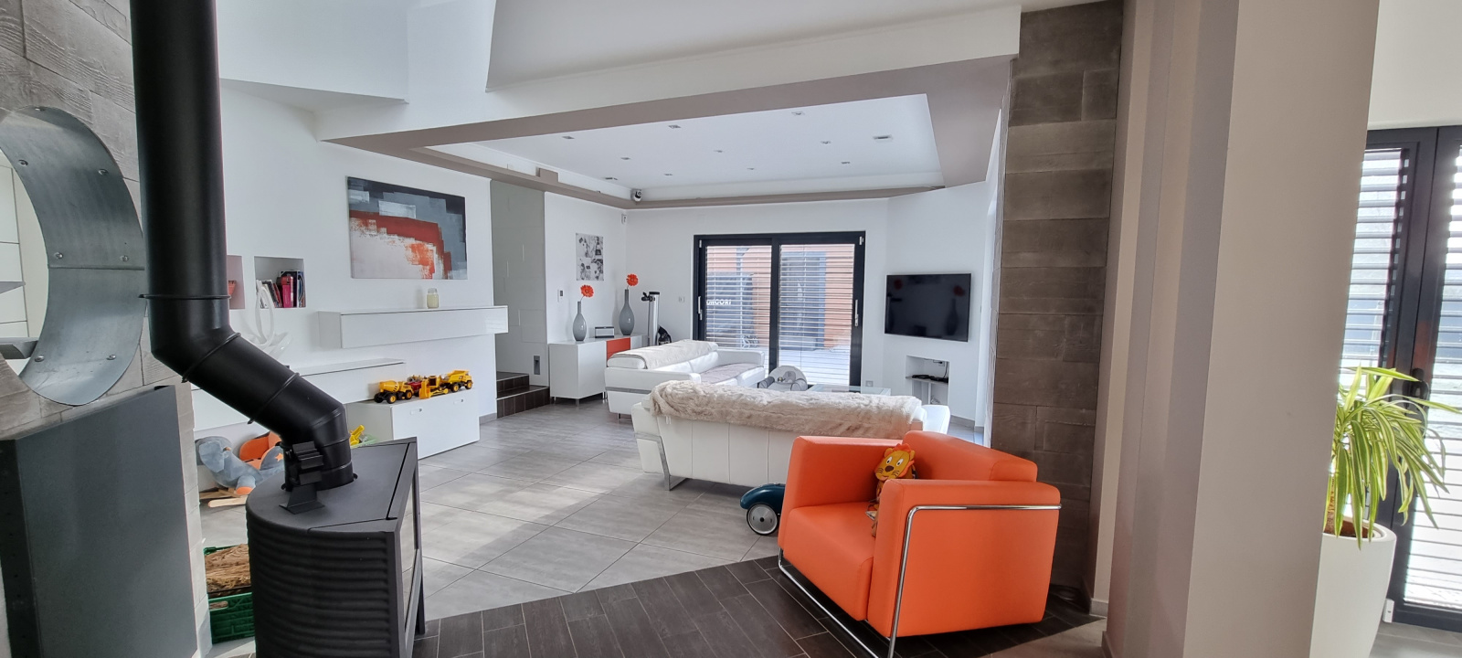 Chauffage au sol électrique et poêle à bois dans le salon.