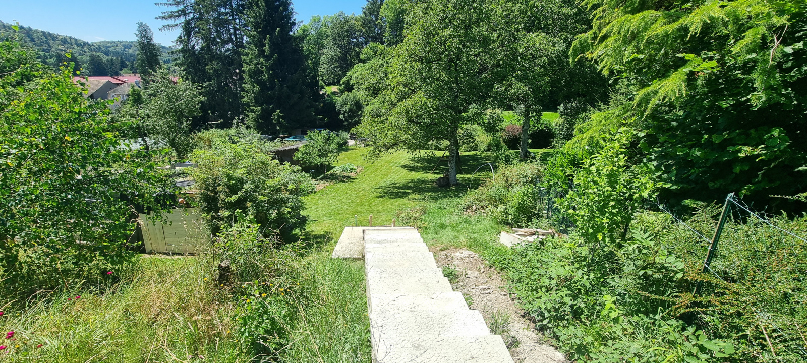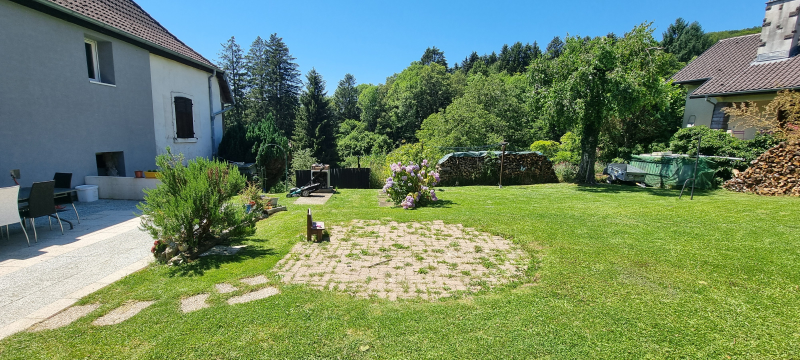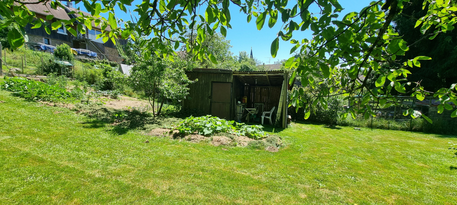 A l’extérieur, joli terrain entièrement clos et arboré, terrasse, poulailler, cabanon.