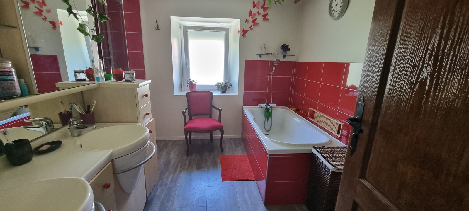 Au premier étage : couloir, toilettes séparées, salle de bains avec douche et baignoire, grande chambre, bureau et trois chambres.