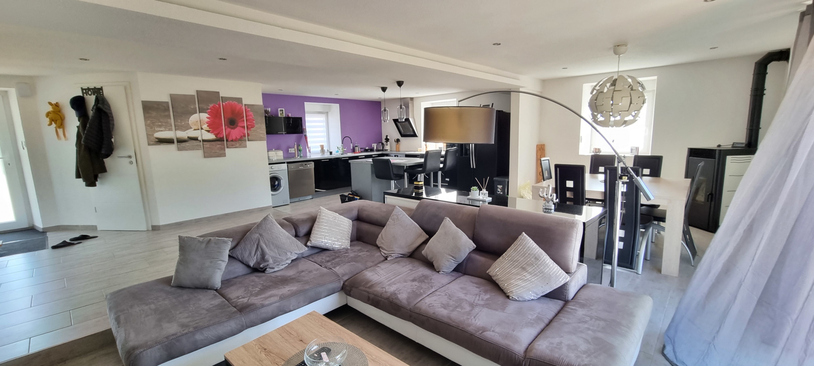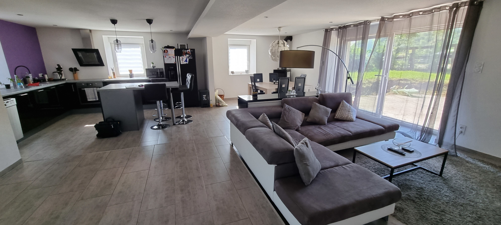 Au rez-de-chaussée : entrée, pièce de vie spacieuse ouverte sur cuisine équipée et meublée (56m²) avec accès direct sur la terrasse et le jardin, toilettes séparées.