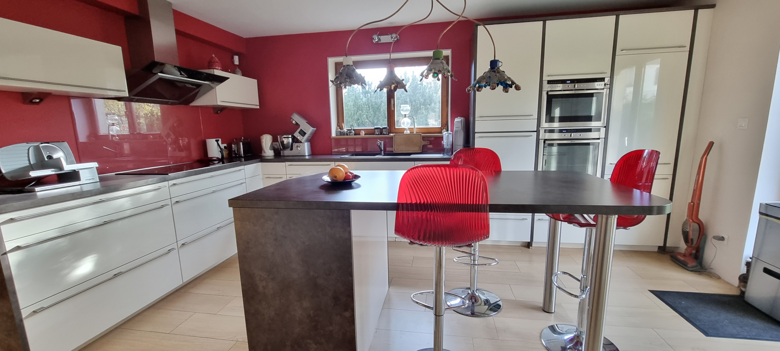 La maison comprend : au rez-de-chaussée, hall d'entrée, cuisine équipée avec accès terrasse, très grande pièce de vie (séjour/salon), couloir, toilettes, bureau.