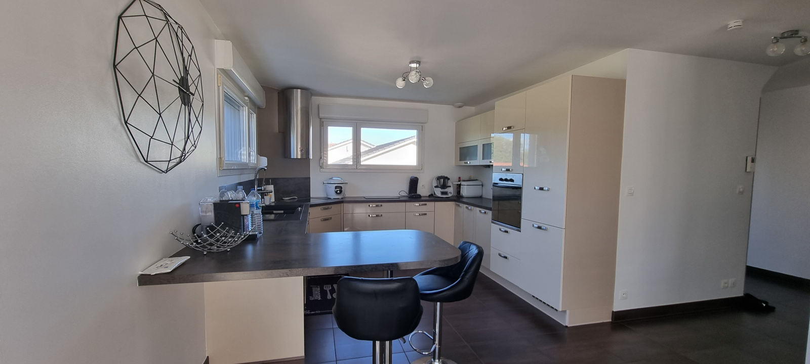 La maison comprend : Hall entrée, couloir, toilettes séparés, bureau, cuisine ouverte sur séjour/salon avec accès terrasse de plain pied.
