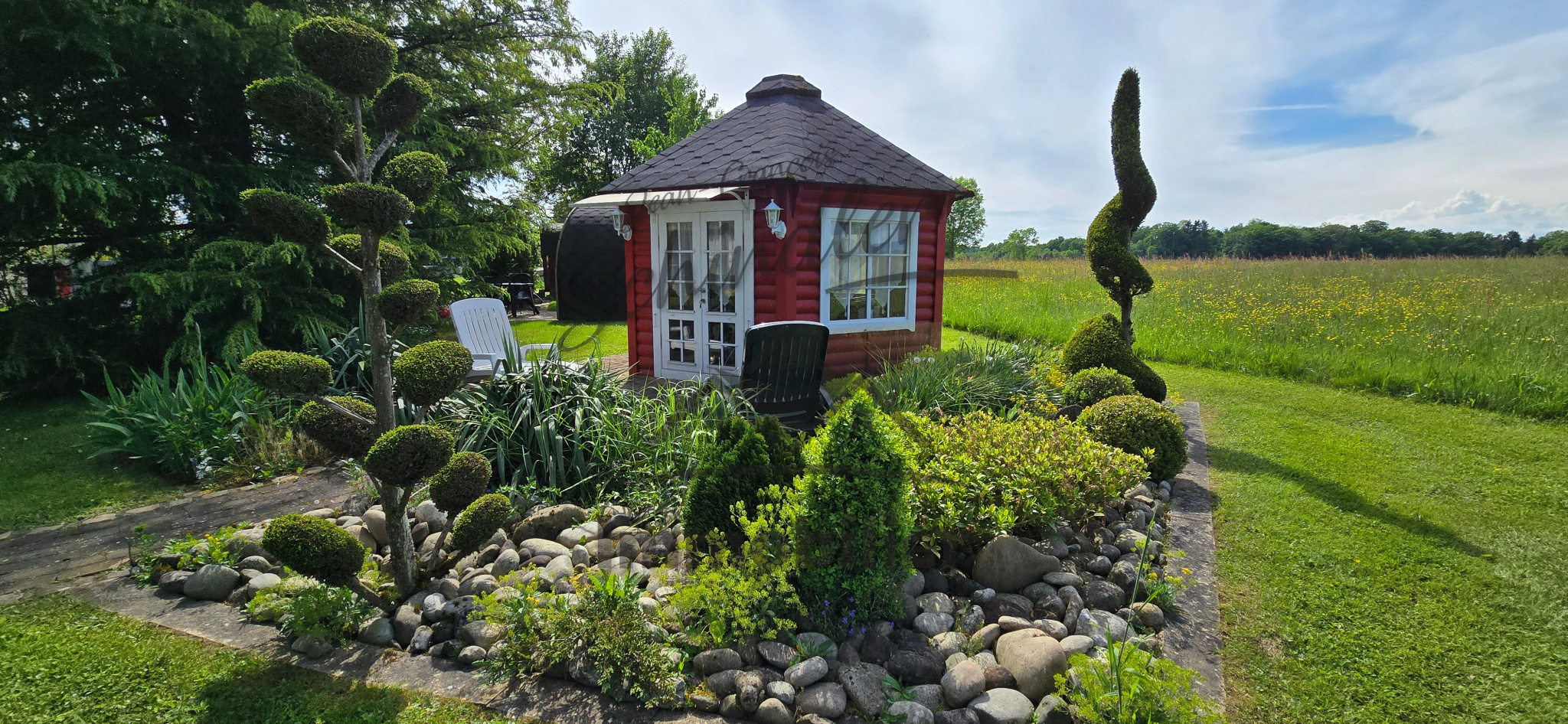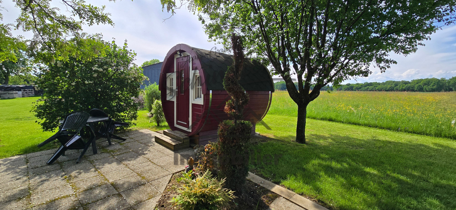 A l’extérieur : magnifique terrain arboré et agrémenté d'une cabane toilettes, de deux cabanes couchages, d'une grande terrasse.