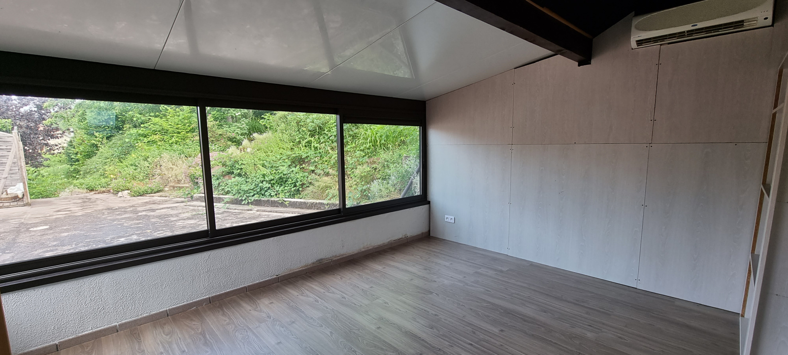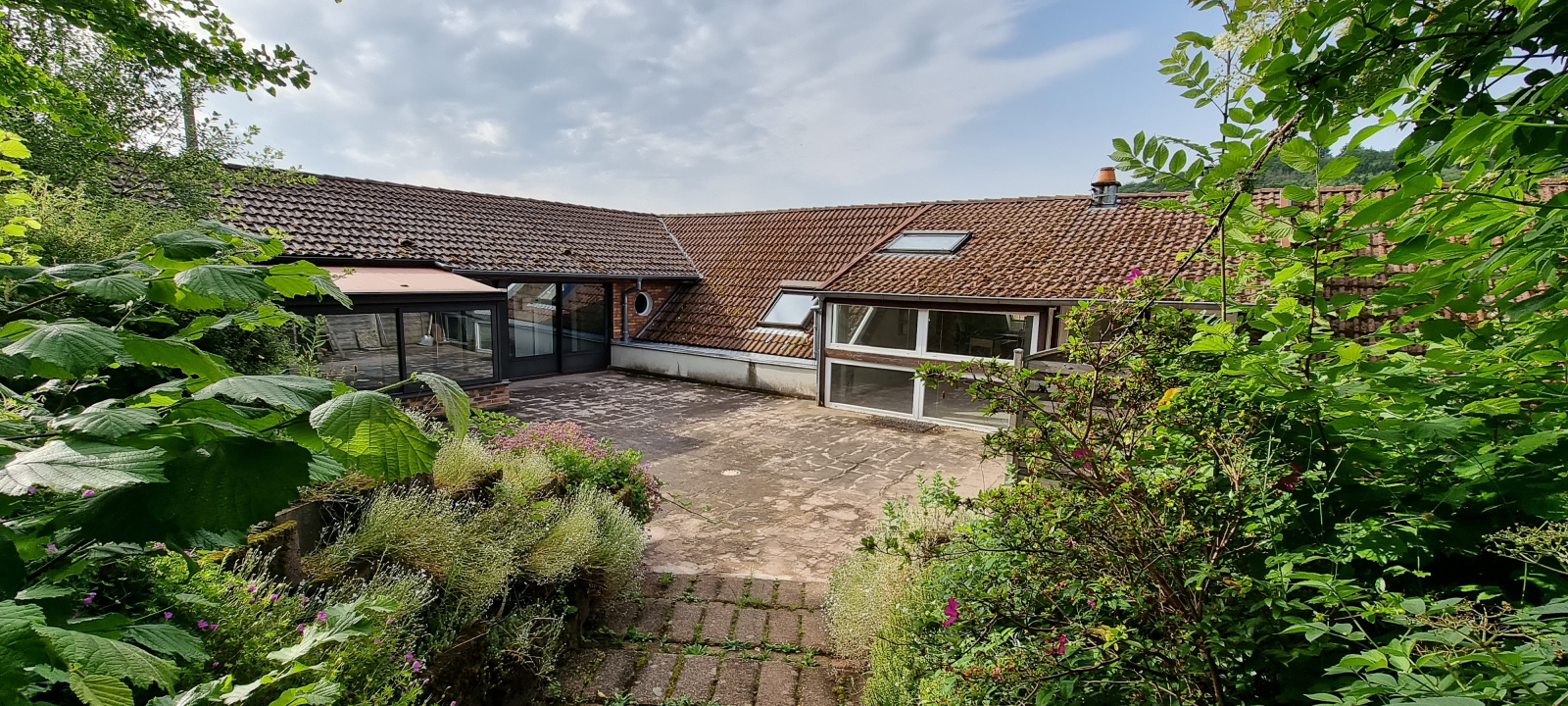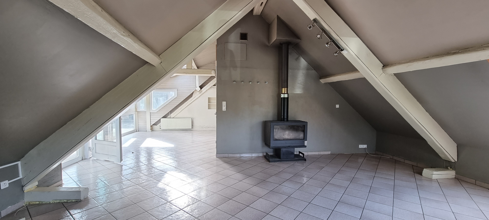 A l'étage : appartement avec grande terrasse et vue nature, composé d'une grande pièce de vie avec cuisine/salon/séjour.