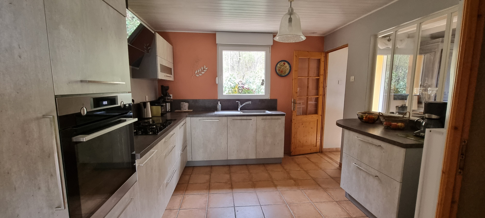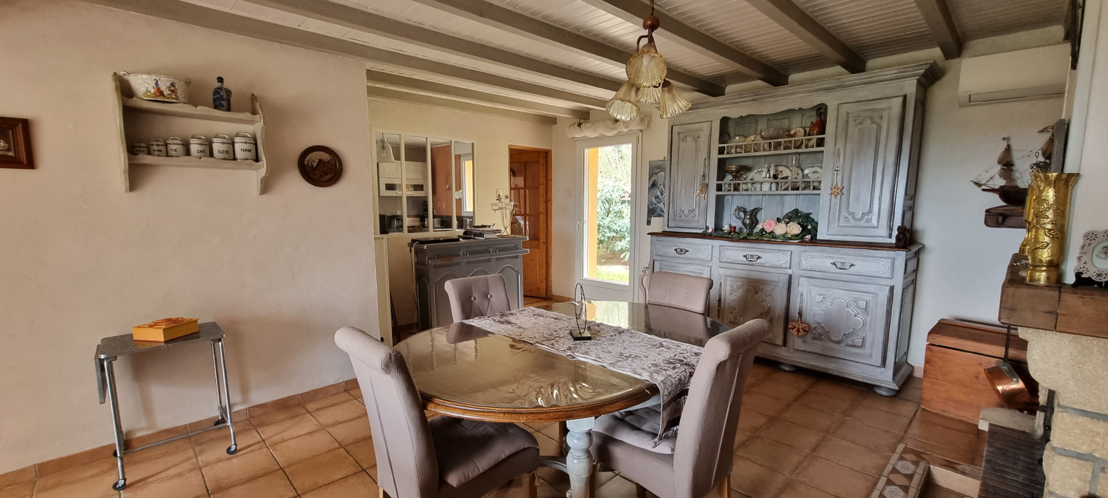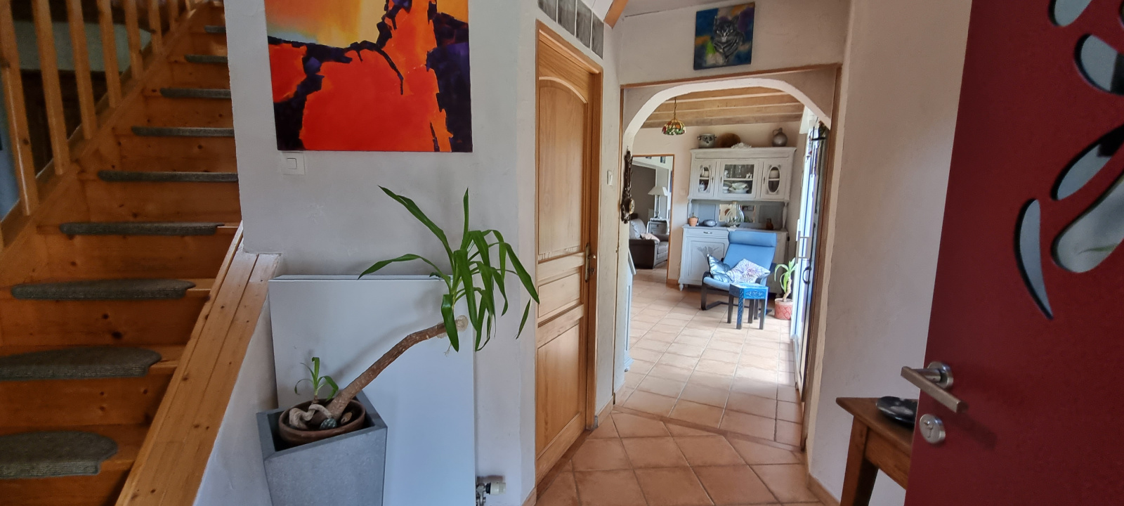 La maison comprend : au rez-de-chaussée, grand hall d'entrée, séjour/salon, cuisine équipée de 2020, salle de bains,