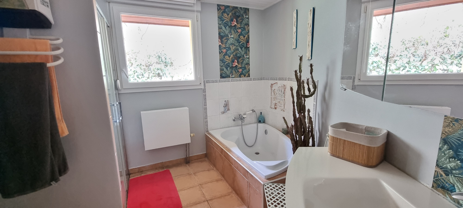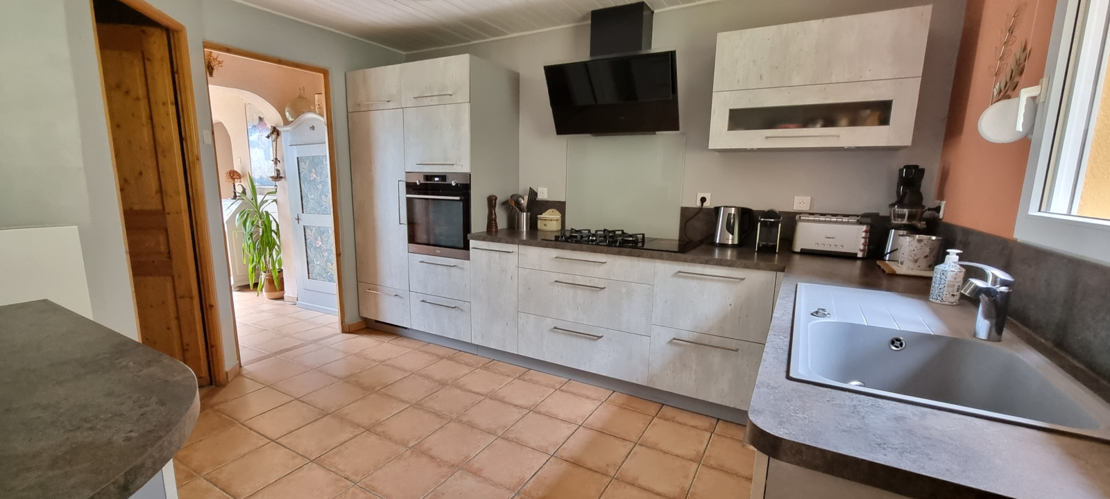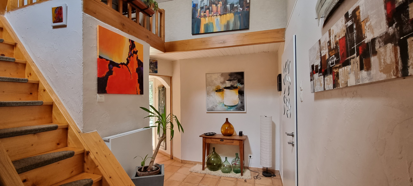 La maison comprend : au rez-de-chaussée, grand hall d'entrée, séjour/salon, cuisine équipée de 2020, salle de bains,