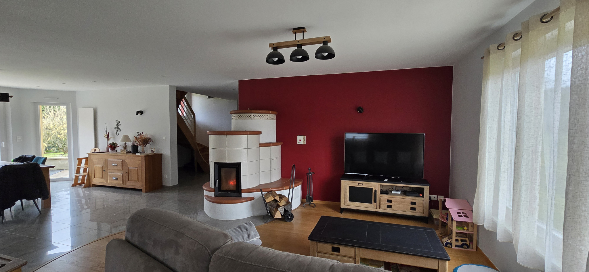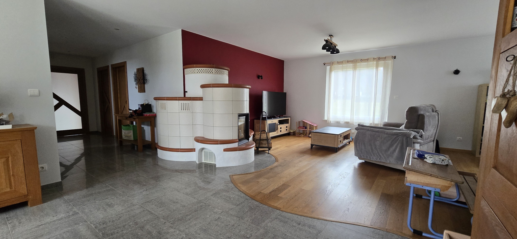 Chauffage poêle kachelofen à grande inertie et à régulation automatique, radiateurs électriques dans toute la maison.