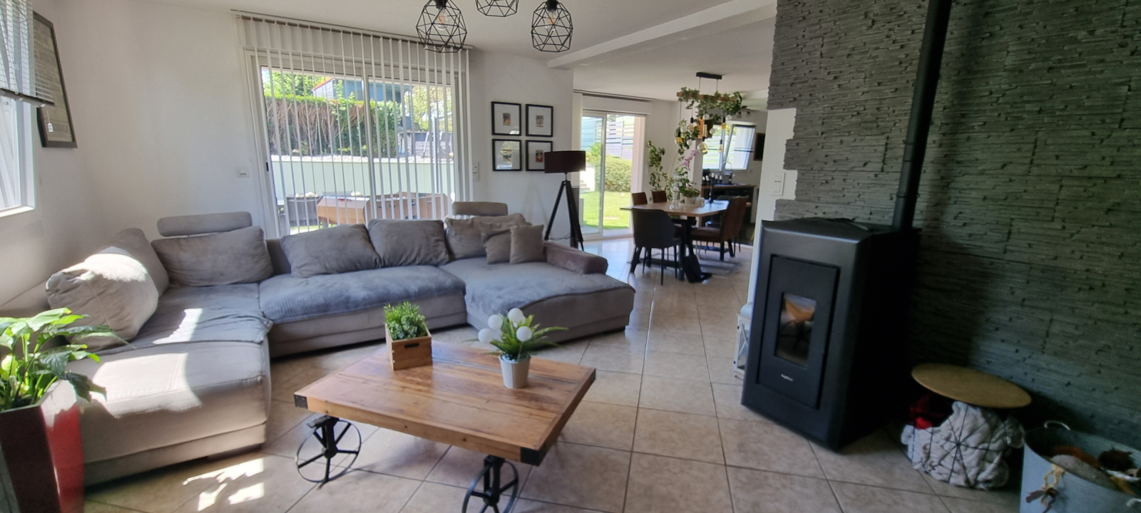 Chauffage Aérothermie sol au rez-de-chaussée et radiateurs à l'étage, poêle à granules dans le salon.