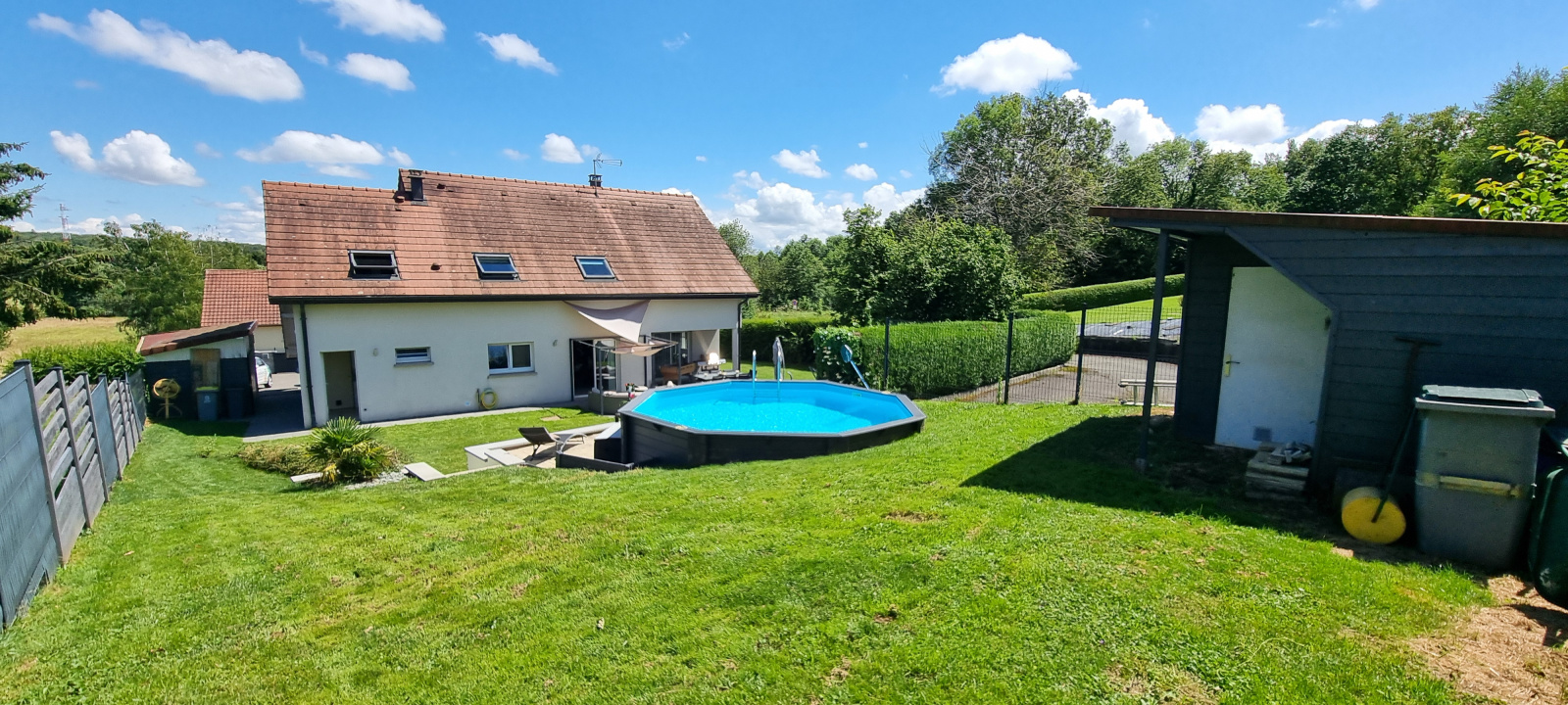 A l’extérieur, joli terrain entièrement clos et paysagé, grande terrasse, cabanon et piscine hors sol sur l'arrière.