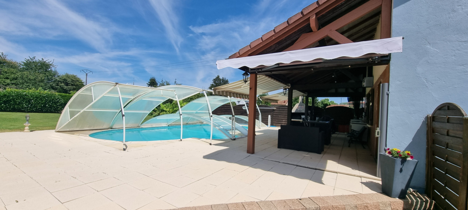 A l’extérieur : terrasse, joli terrain arboré, piscine enterrée avec liner, traitement au Chlore, pool house avec cuisine d'été, douche etc...hangar.