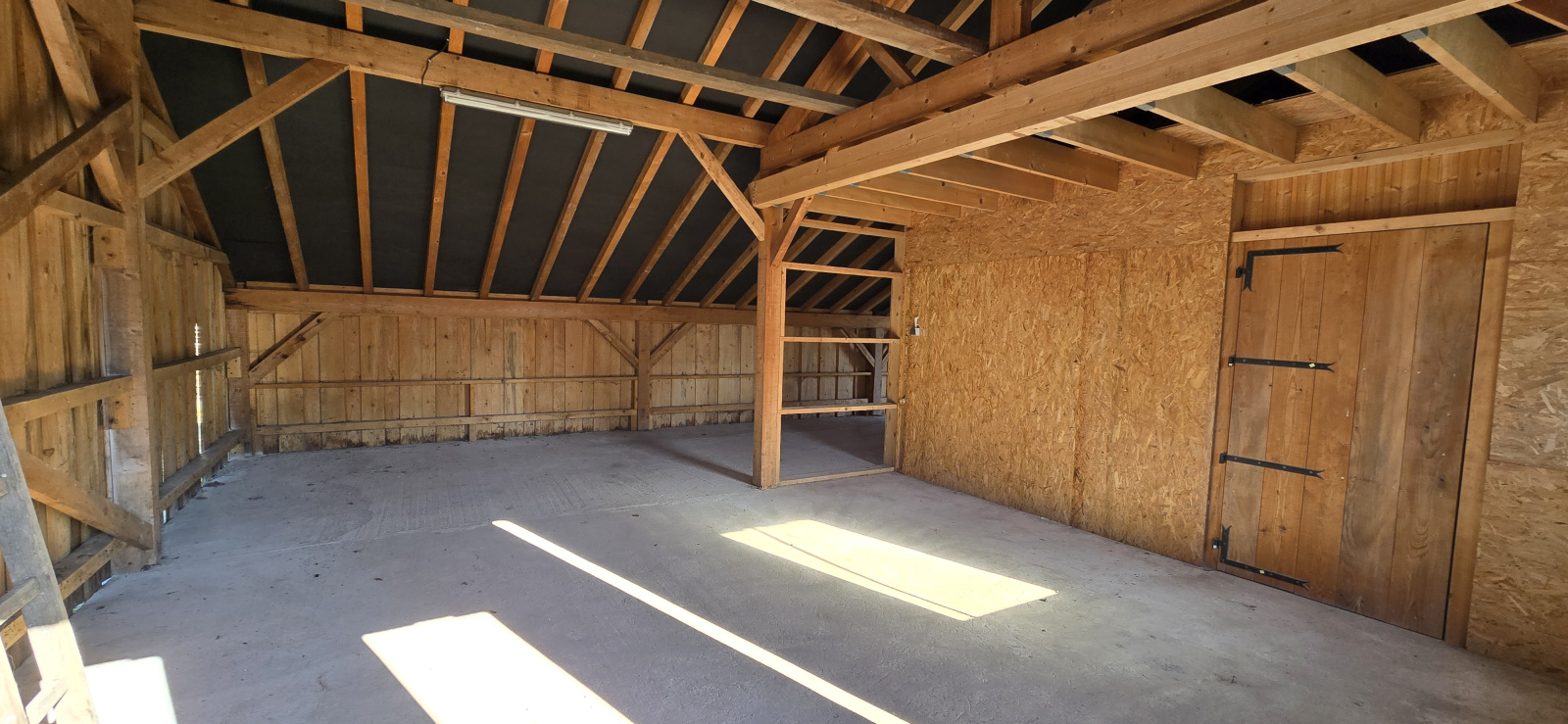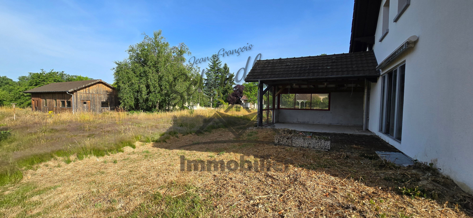 A l’extérieur, joli terrain arboré, grand hangar de stockage avec atelier.