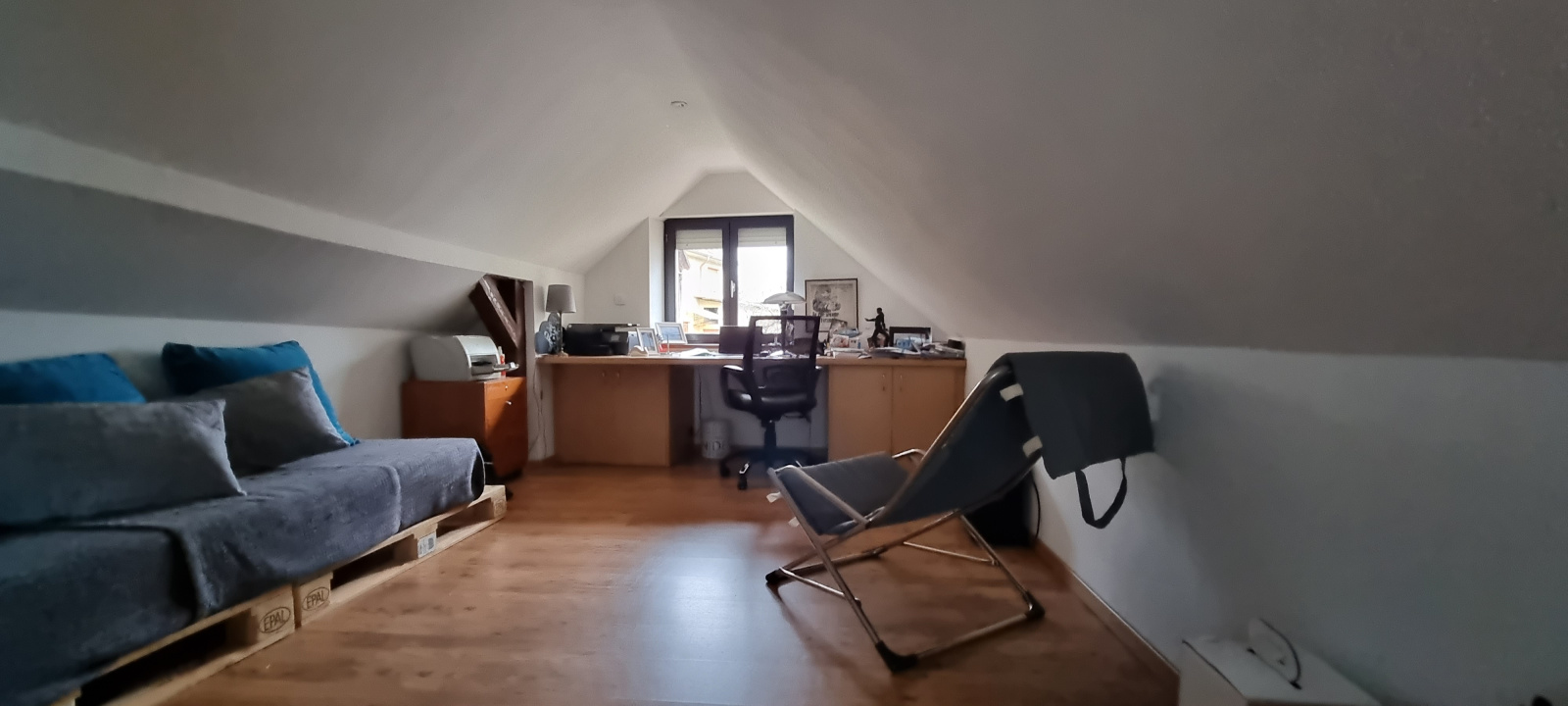 A l'étage dans les combles : mezzanine, dégagement, toilettes, deux chambres.