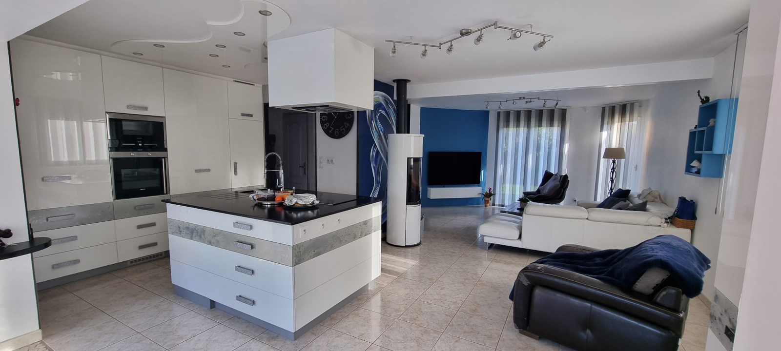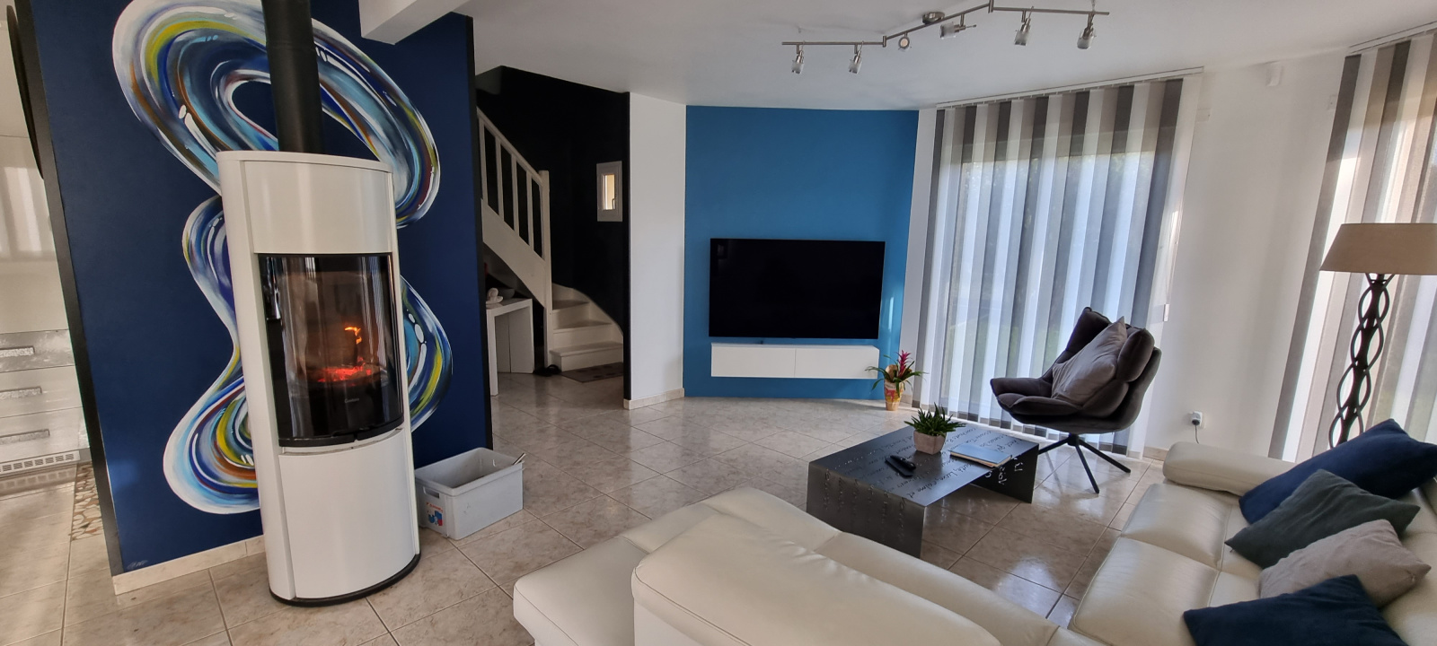 Chauffage au rez-de-chaussée : poêle à bois et chauffage électrique au sol