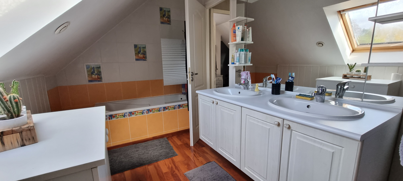 Au premier étage : petite mezzanine, salle de bains avec toilettes, quatre chambres.