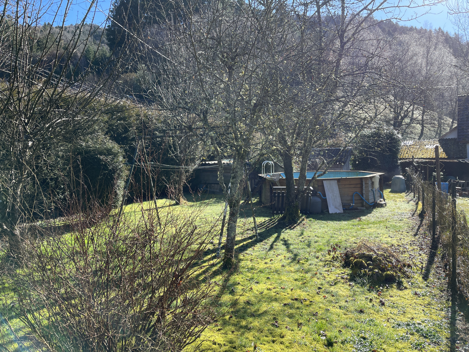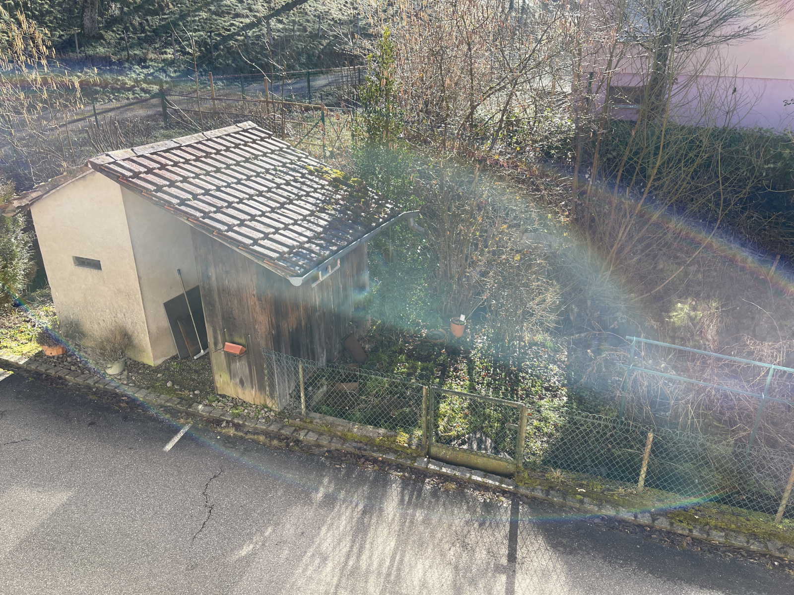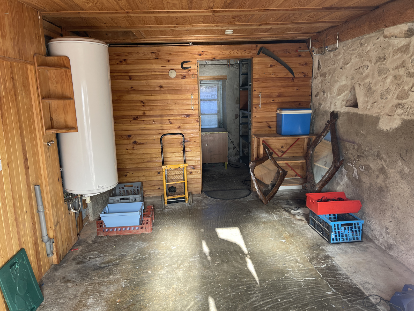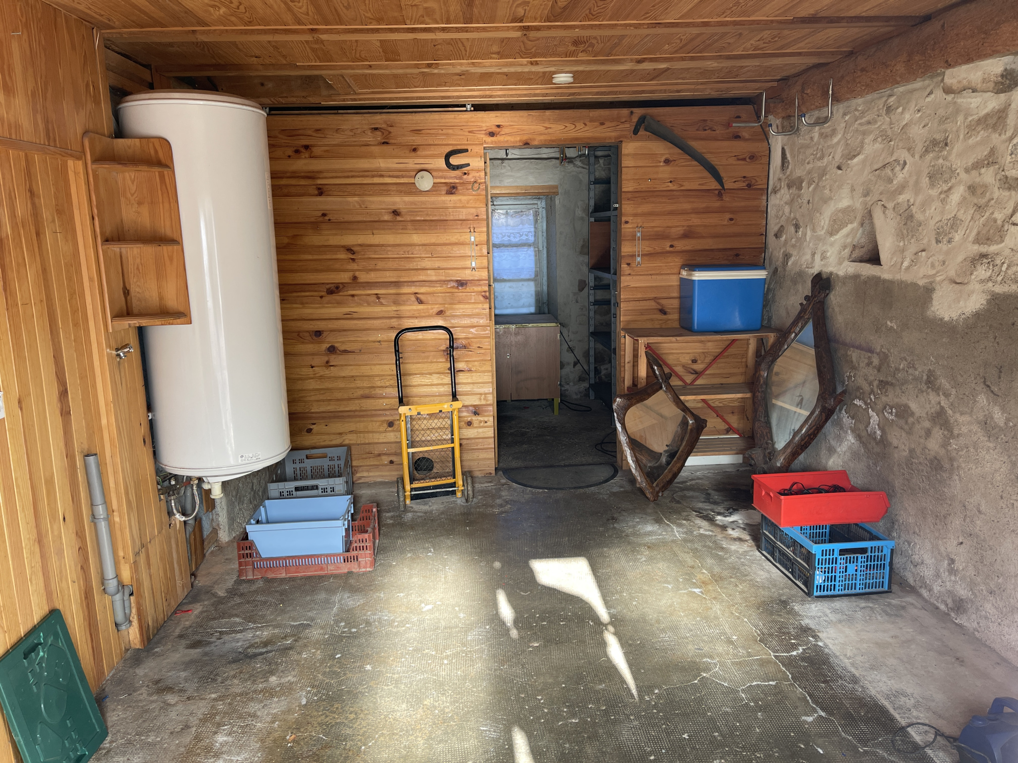 A l’extérieur, remise en bois, garage.