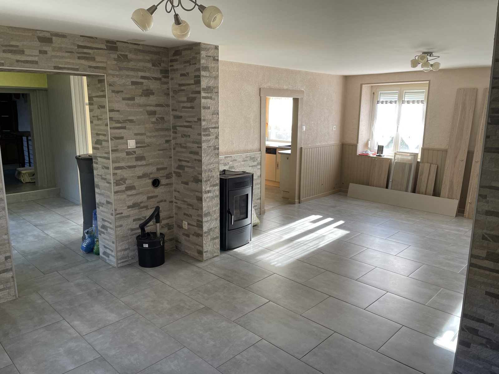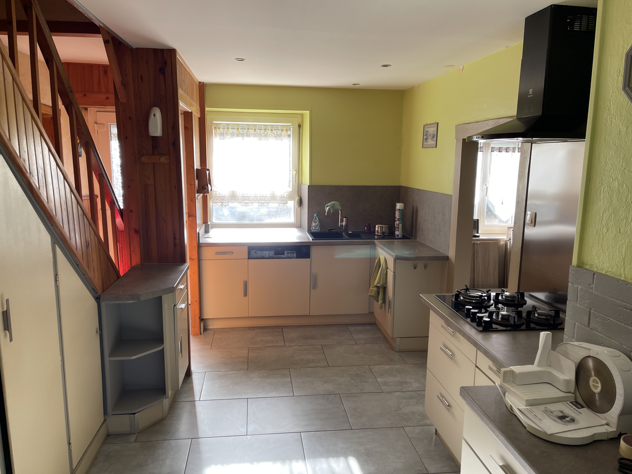 La maison comprend : au rez-de-chaussée, entrée, cuisine (accès terrasse arrière), couloir, salon-séjour, piéce cuisine, salle d’eau, toilettes séparées, pièce rangements,