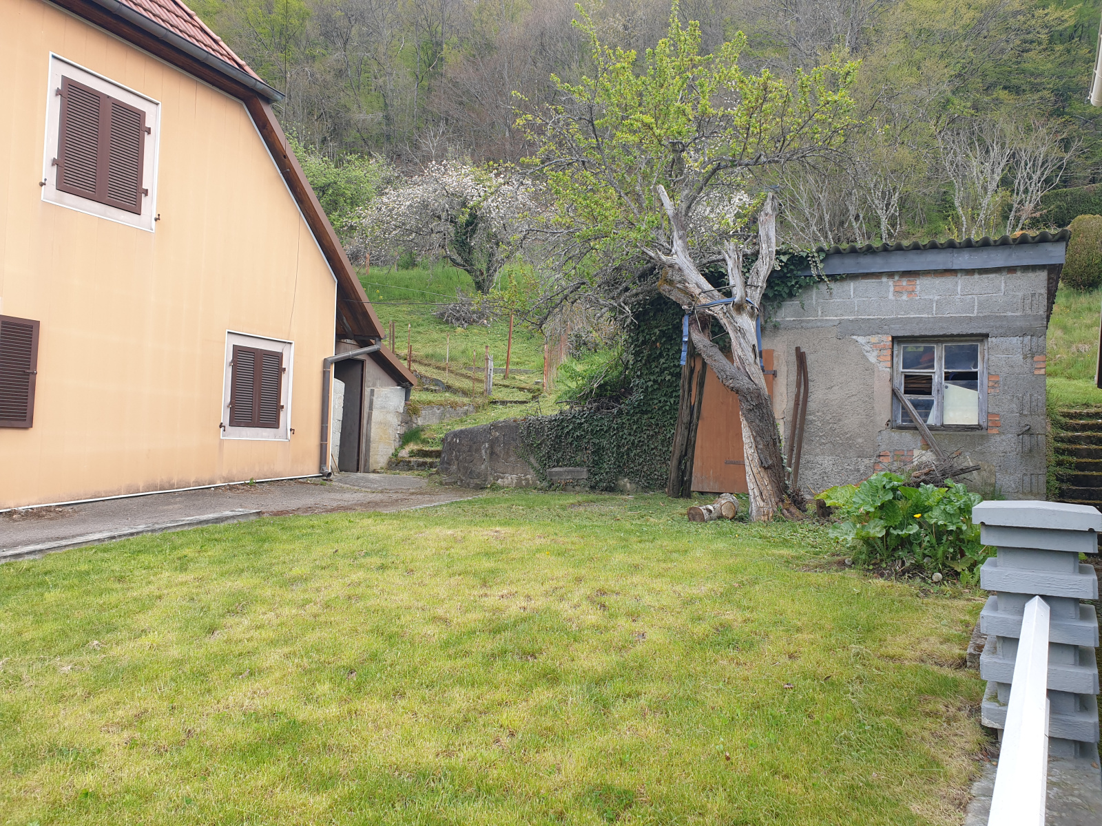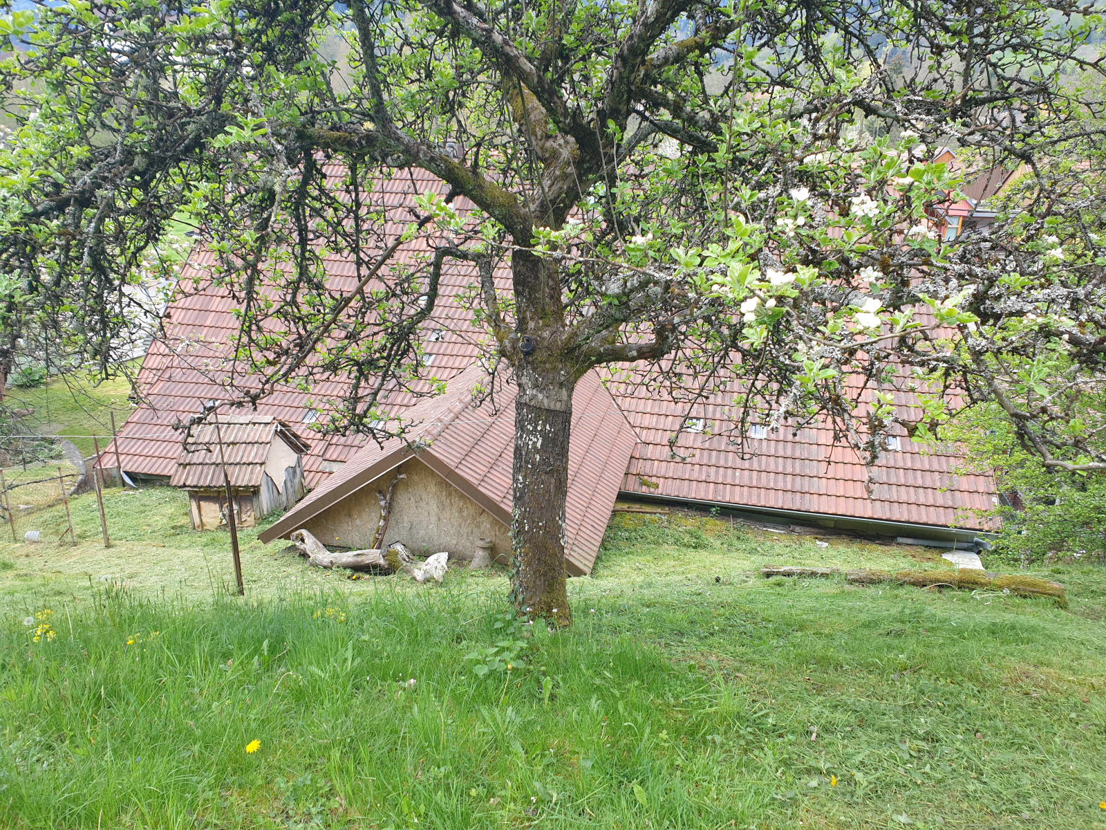 A l’extérieur : terrain clos et arboré, accès goudronné, abris à bois.