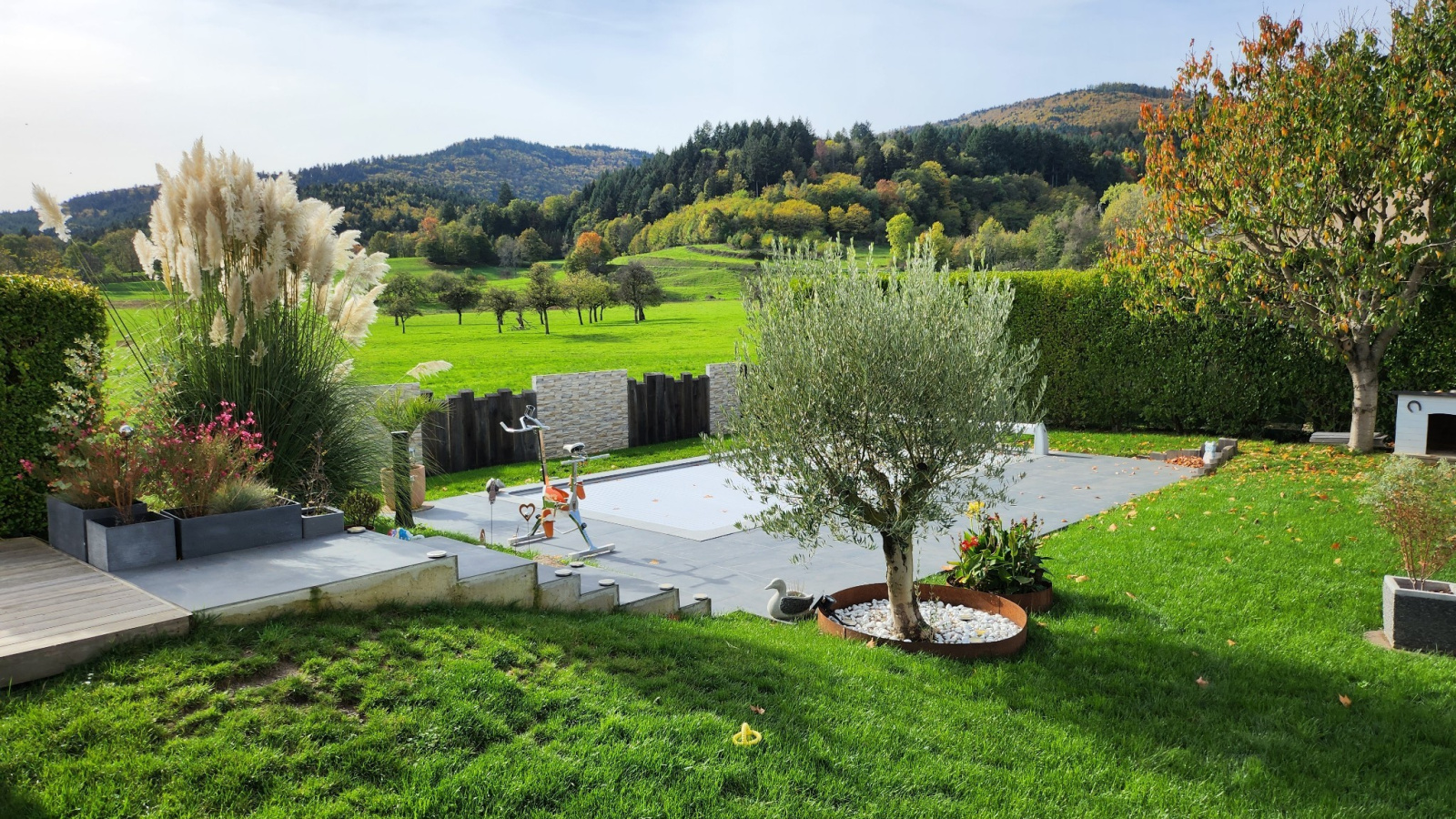 A l’extérieur, terrain entièrement clos et arboré, cabanon, terrasse, jardin, piscine de 2021 (chauffée).
