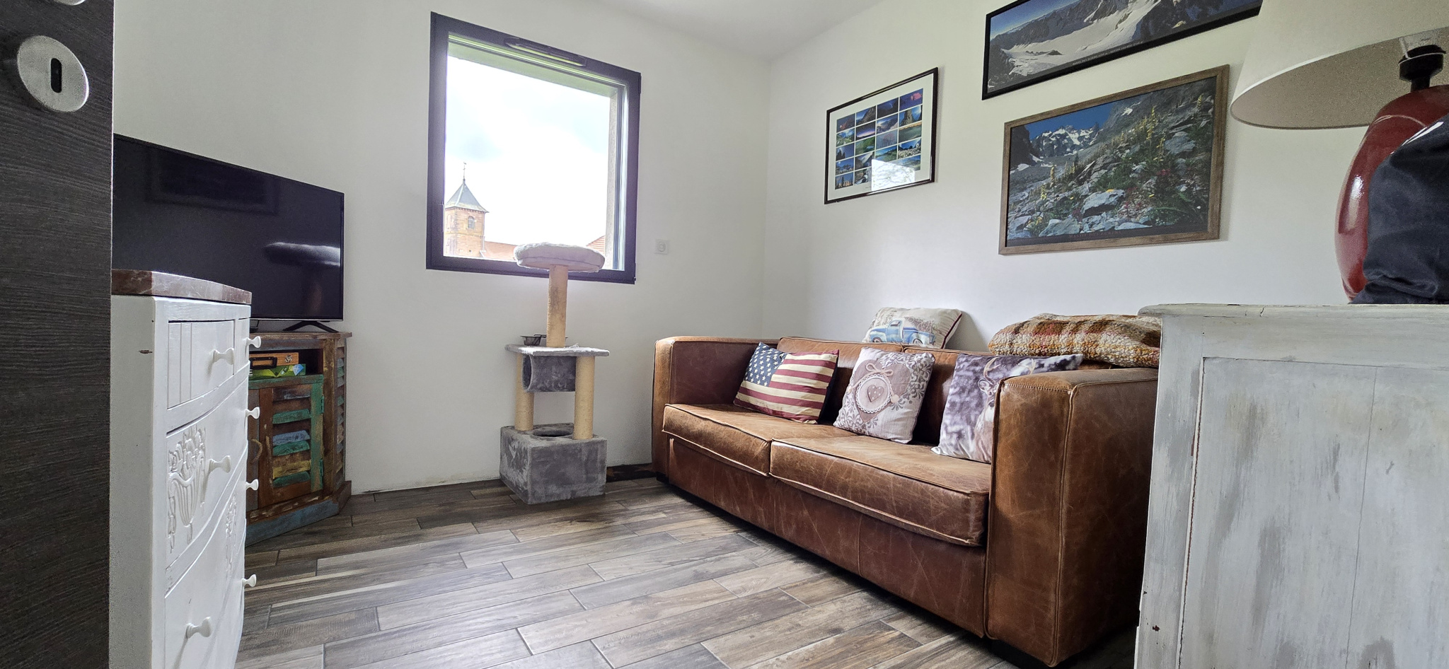 Chauffage au sol électrique et poêle à granules dans le salon/séjour.