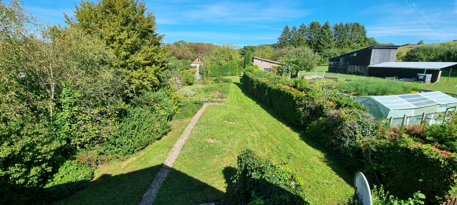 A l’extérieur, terrain entièrement clos et arboré, double garage, jardin, verger, cour.